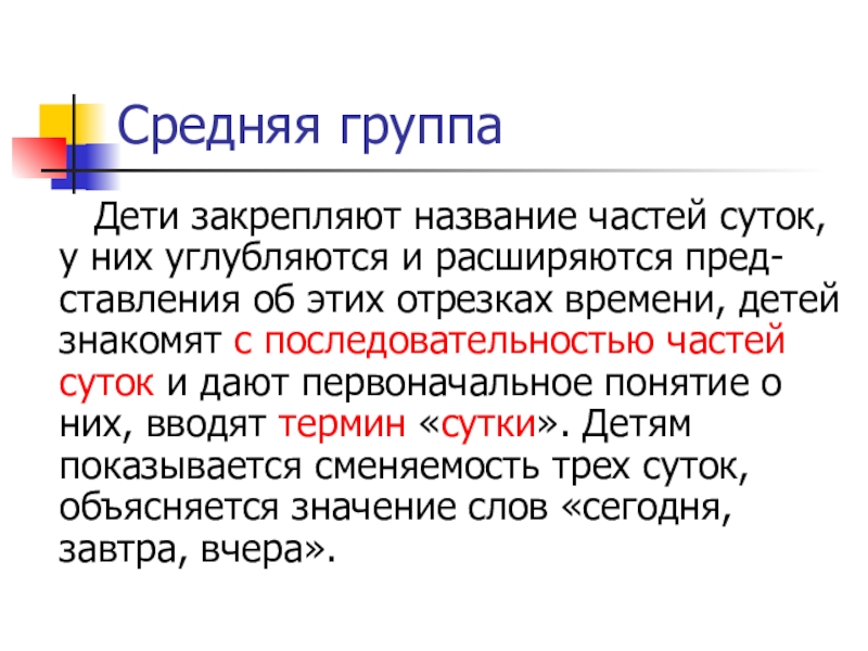 В средней группе эти знания углубляют, расши-ряют и дают представление о последовательности частей суток.
