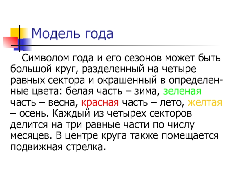 на четыре равных сектора и окрашенный в определен-ные цвета: белая часть – зима, зеленая часть – весна, красная часть – лето, желтая – осень. Каждый из четырех секторов делится на три равные части по числу месяцев. В центре круга также помещается подвижная стрелка.