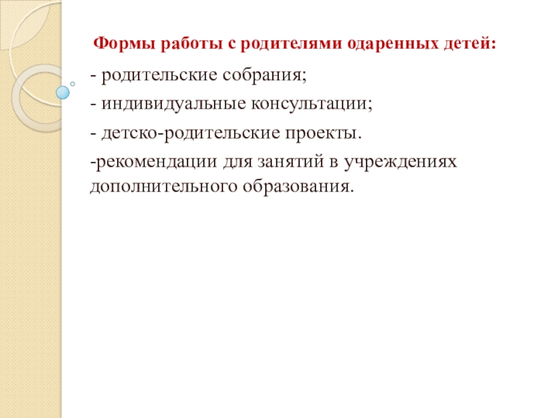Формы работы с родителями одаренных детей: - родительские собрания;- индивидуальные консультации;- детско-родительские проекты.-рекомендации для занятий в учреждениях