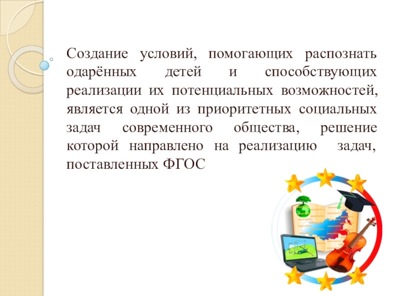 Создание условий, помогающих распознать одарённых детей и способствующих реализации их потенциальных возможностей, является одной из приоритетных социальных задач современного общества, решение которой направлено на реализацию задач, поставленных ФГОС