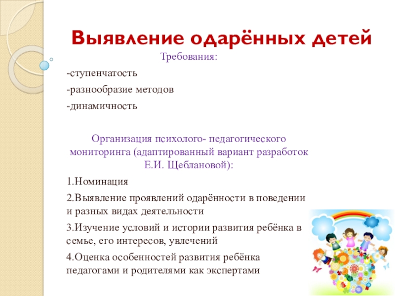 Выявление одарённых детейТребования:-ступенчатость-разнообразие методов-динамичностьОрганизация психолого- педагогического мониторинга (адаптированный вариант разработок Е.И. Щеблановой):1.Номинация 2.Выявление проявлений одарённости в поведении