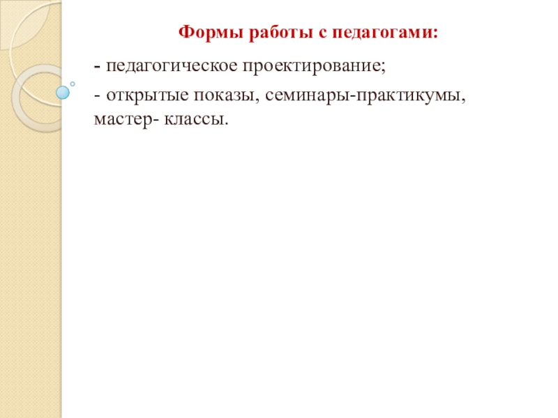 Формы работы с педагогами: - педагогическое проектирование;- открытые показы, семинары-практикумы, мастер- классы.