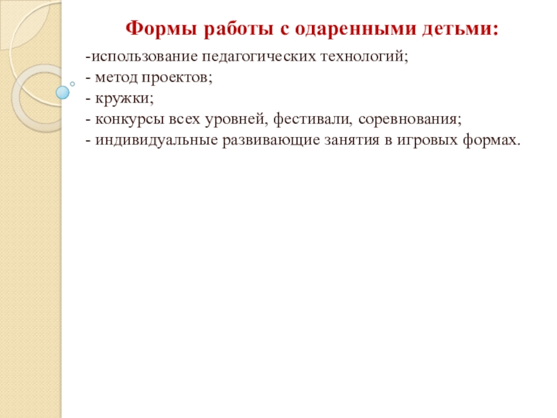 Формы работы с одаренными детьми: -использование педагогических технологий;- метод проектов;- кружки; - конкурсы всех уровней, фестивали, соревнования;-