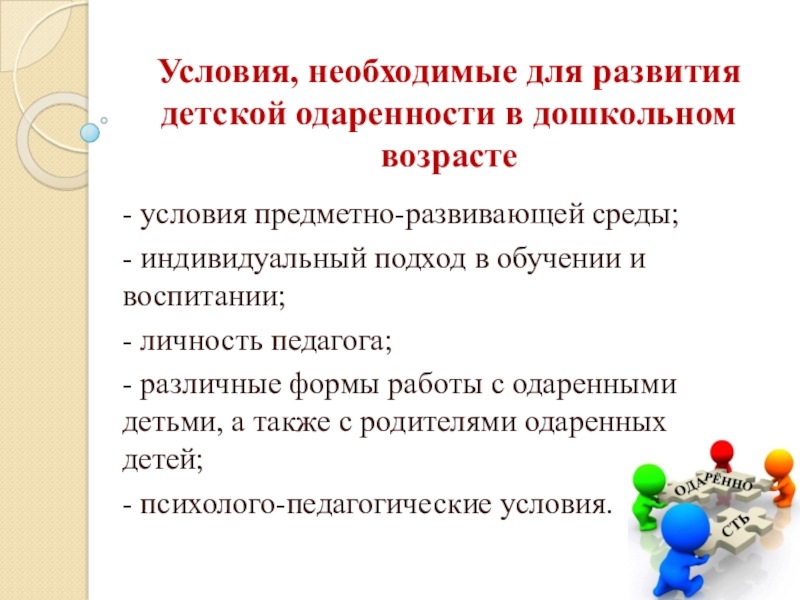 Условия, необходимые для развития детской одаренности в дошкольном возрасте- условия предметно-развивающей среды;- индивидуальный подход в обучении и