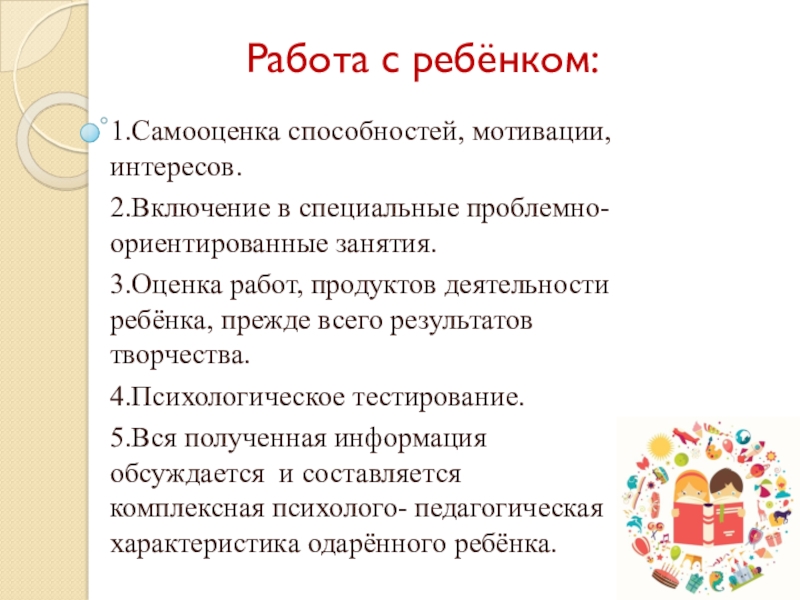 Работа с ребёнком: 1.Самооценка способностей, мотивации, интересов.2.Включение в специальные проблемно- ориентированные занятия.3.Оценка работ, продуктов деятельности ребёнка, прежде