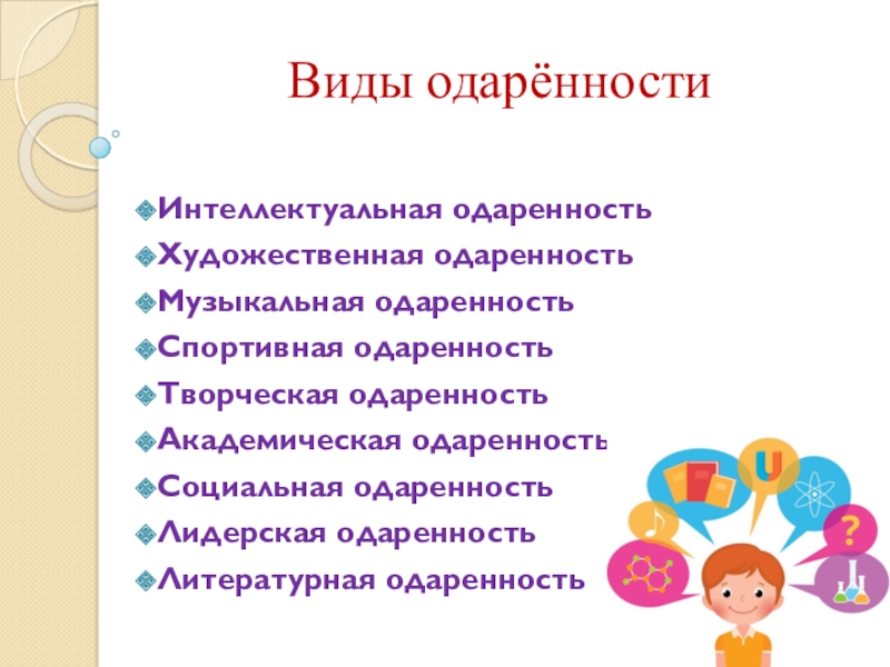 Виды одарённости  Интеллектуальная одаренностьХудожественная одаренностьМузыкальная одаренностьСпортивная одаренностьТворческая одаренностьАкадемическая одаренностьСоциальная одаренностьЛидерская одаренностьЛитературная одаренность
