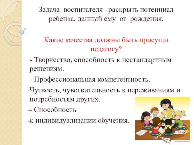 Задача воспитателя– раскрыть потенциал ребенка, данный ему от рождения. Какие качества должны быть присущи педагогу?- Творчество, способность