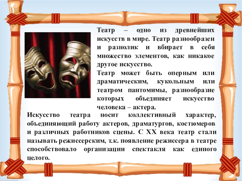 Искусство театра носит коллективный характер, объединяющий работу актеров, драматургов, костюмеров и различных работников сцены. С ХХ века театр стали называть режиссерским, т.к. появление режиссера в театре способствовало организации спектакля как единого целого.
