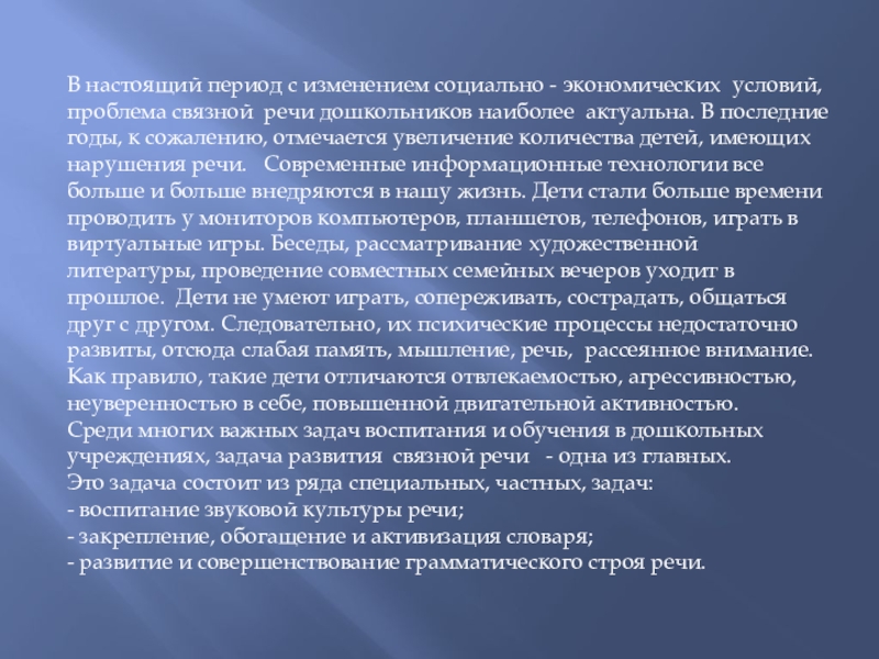 речи дошкольников наиболее актуальна. В последние годы, к сожалению, отмечается увеличение количества детей, имеющих нарушения речи. Современные информационные технологии все больше и больше внедряются в нашу жизнь. Дети стали больше времени проводить у мониторов компьютеров, планшетов, телефонов, играть в виртуальные игры. Беседы, рассматривание художественной литературы, проведение совместных семейных вечеров уходит в прошлое. Дети не умеют играть, сопереживать, сострадать, общаться друг с другом. Следовательно, их психические процессы недостаточно развиты, отсюда слабая память, мышление, речь, рассеянное внимание. Как правило, такие дети отличаются отвлекаемостью, агрессивностью, неуверенностью в себе, повышенной двигательной активностью.