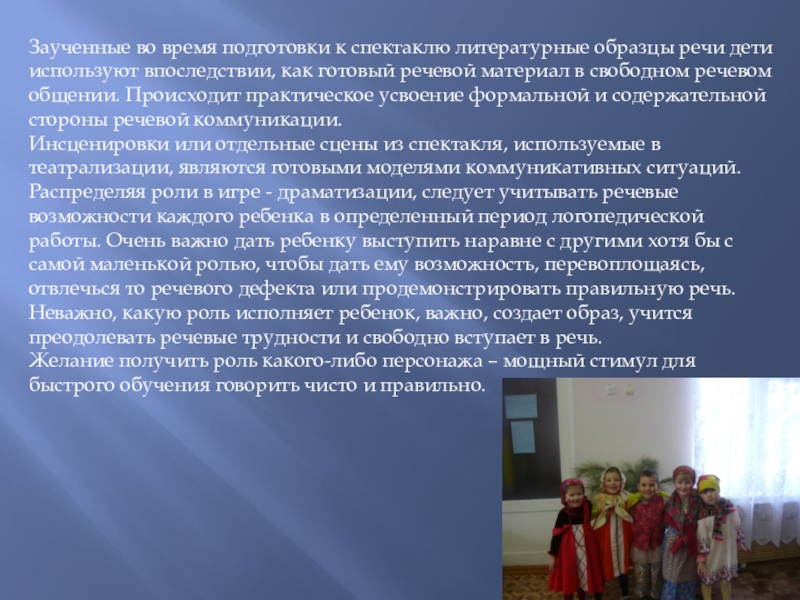 Слайд 9Заученные во время подготовки к спектаклю литературные образцы речи дети используют
