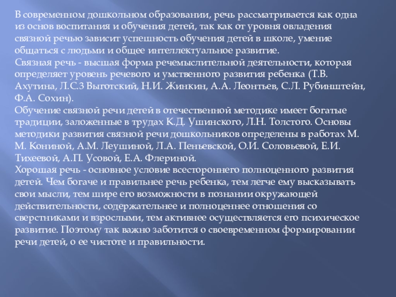 Обучение связной речи детей в отечественной методике имеет богатые традиции, заложенные в трудах К.Д. Ушинского, Л.Н. Толстого. Основы методики развития связной речи дошкольников определены в работах М.М. Кониной, А.М. Леушиной, Л.А. Пеньевской, О.И. Соловьевой, Е.И. Тихеевой, А.П. Усовой, Е.А. Флериной.