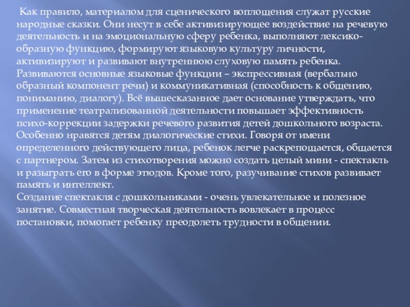 Слайд 8 Как правило, материалом для сценического воплощения служат русские народные сказки. Они