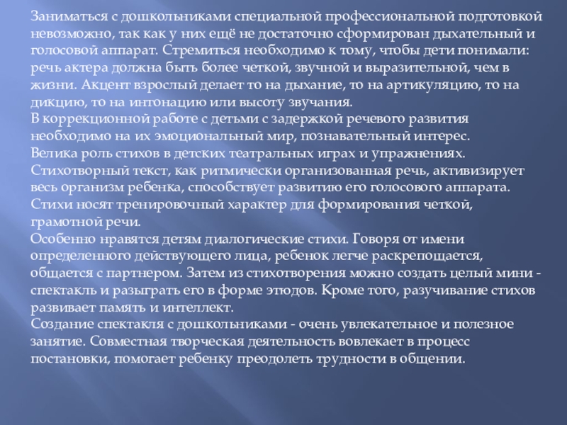 Велика роль стихов в детских театральных играх и упражнениях. Стихотворный текст, как ритмически организованная речь, активизирует весь организм ребенка, способствует развитию его голосового аппарата. Стихи носят тренировочный характер для формирования четкой, грамотной речи.