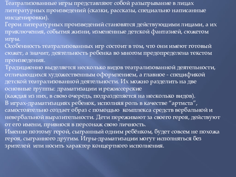 Именно поэтому герой, сыгранный одним ребёнком, будет совсем не похожа героя, сыгранного другим. Игры-драматизации могут исполняться без зрителей или носить характер концертного исполнения.