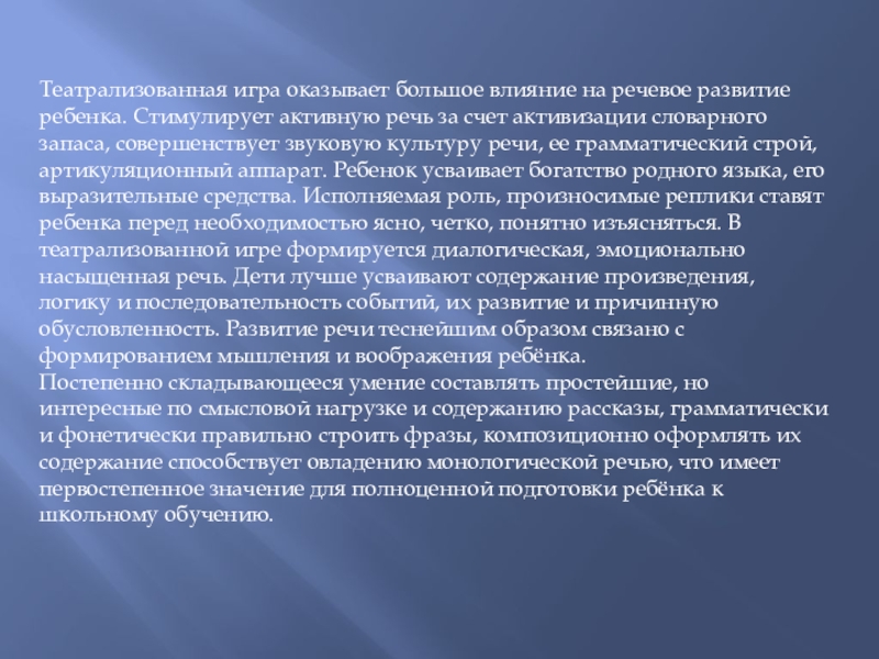 Слайд 4Театрализованная игра оказывает большое влияние на речевое развитие ребенка. Стимулирует активную