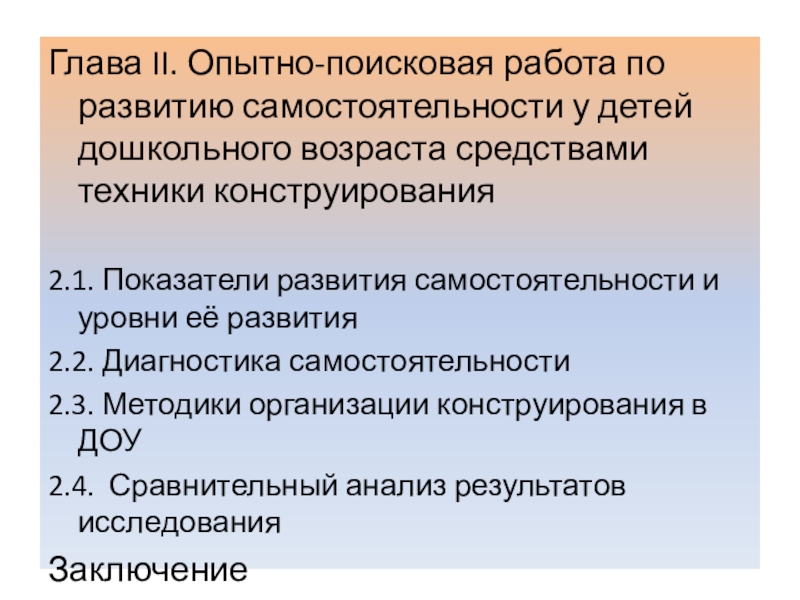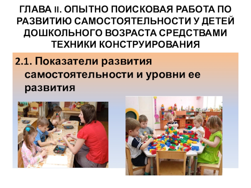Слайд 9Глава II. Опытно-поисковая работа по развитию самостоятельности у детей дошкольного возраста