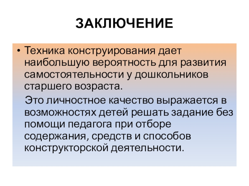 Это личностное качество выражается в возможностях детей решать задание без помощи педагога при отборе содержания, средств и способов конструкторской деятельности.
