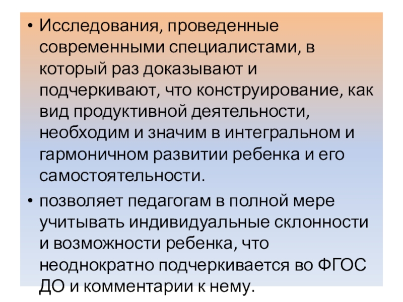 конструирование, как вид продуктивной деятельности, необходим и значим в интегральном и гармоничном развитии ребенка и его самостоятельности.