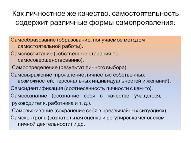 Слайд 13Как личностное же качество, самостоятельность содержит различные формы самопроявления: