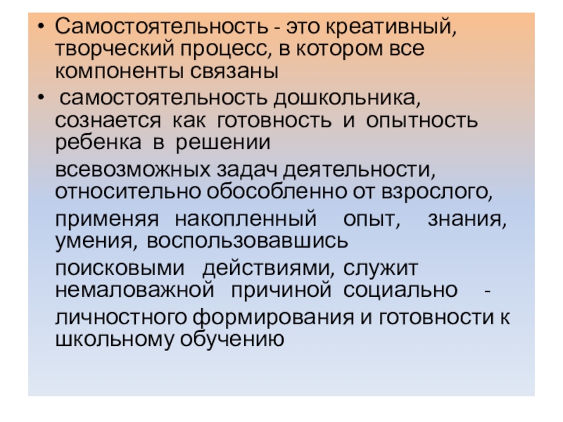 Слайд 16Самостоятельность - это креативный, творческий процесс, в котором все компоненты связаны