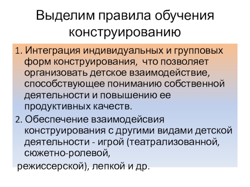 Слайд 23Выделим правила обучения конструированию
