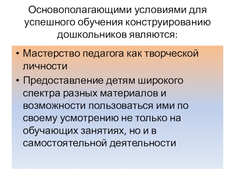 Основополагающими условиями для успешного обучения конструированию дошкольников являются: