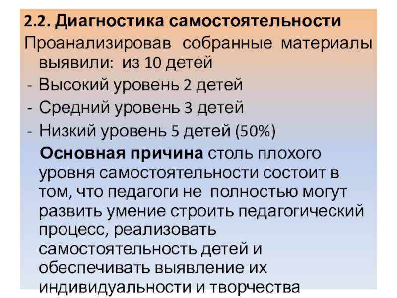 Основная причина столь плохого уровня самостоятельности состоит в том, что педагоги не полностью могут развить умение строить педагогический процесс, реализовать самостоятельность детей и обеспечивать выявление их индивидуальности и творчества