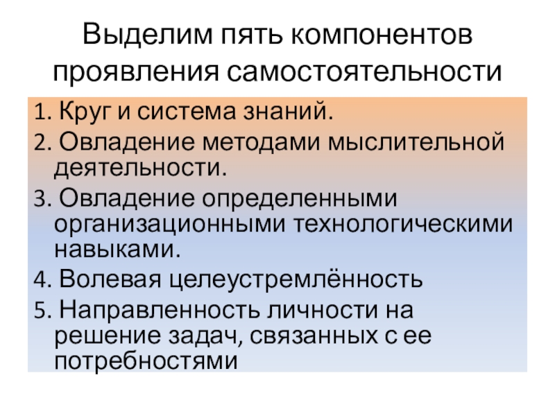 Слайд 12Выделим пять компонентов проявления самостоятельности