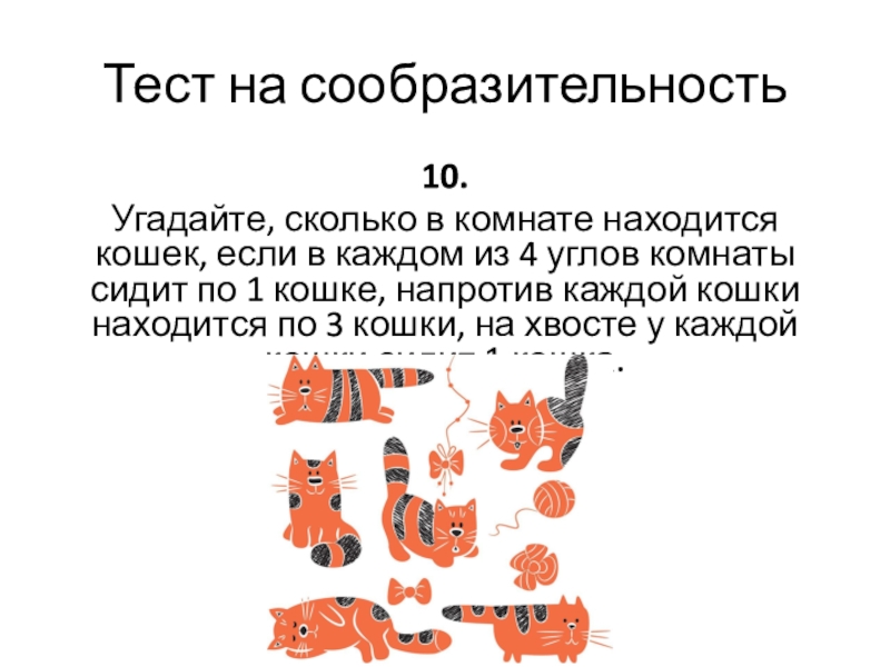 каждом из 4 углов комнаты сидит по 1 кошке, напротив каждой кошки находится по 3 кошки, на хвосте у каждой кошки сидит 1 кошка.