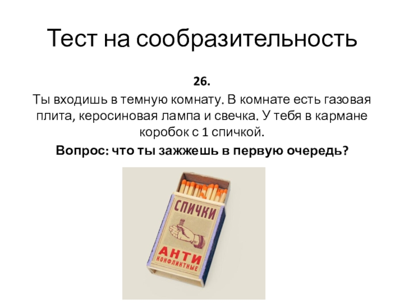 Ты входишь в темную комнату. В комнате есть газовая плита, керосиновая лампа и свечка. У тебя в кармане коробок с 1 спичкой. Вопрос: что ты зажжешь в первую очередь?
