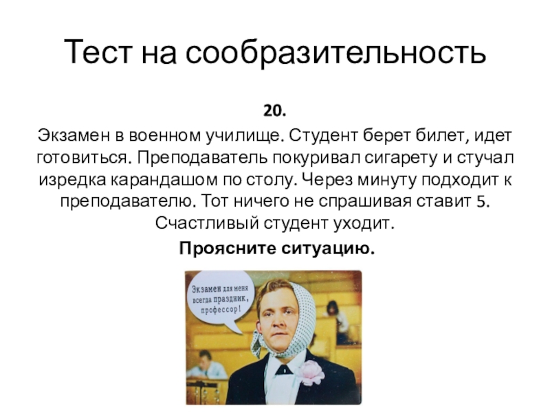 Ответ Преподаватель на языке азбуки Морзе набивал карандашом по столу: "Кому нужна пятерка подходите, поставлю". Всего один студент был по-военному бдителен и обратил внимание на шифровку преподавателя. За это он и получил 5.