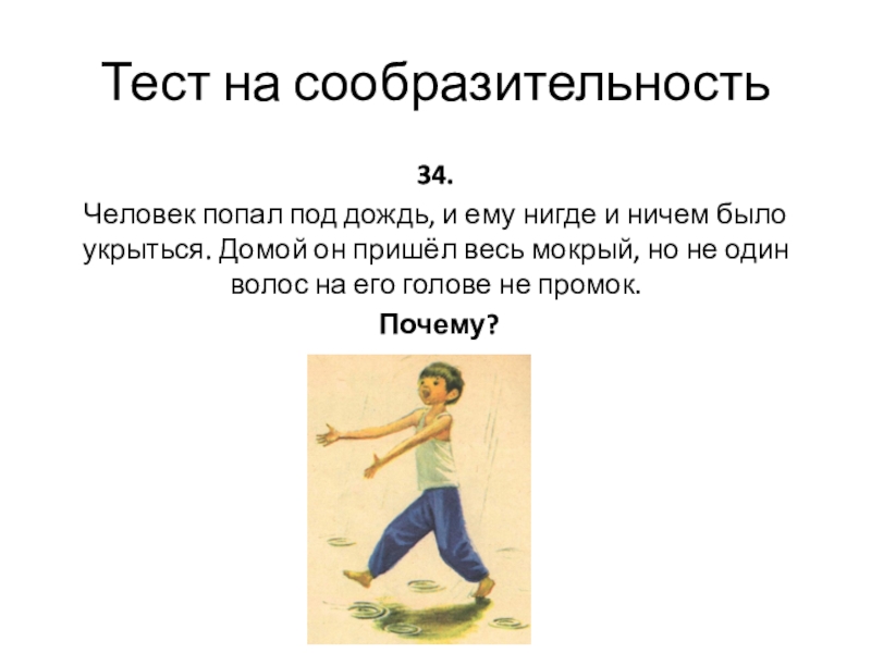 Человек попал под дождь, и ему нигде и ничем было укрыться. Домой он пришёл весь мокрый, но не один волос на его голове не промок. Почему?