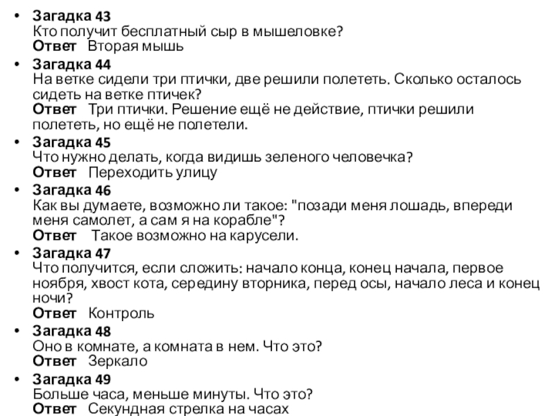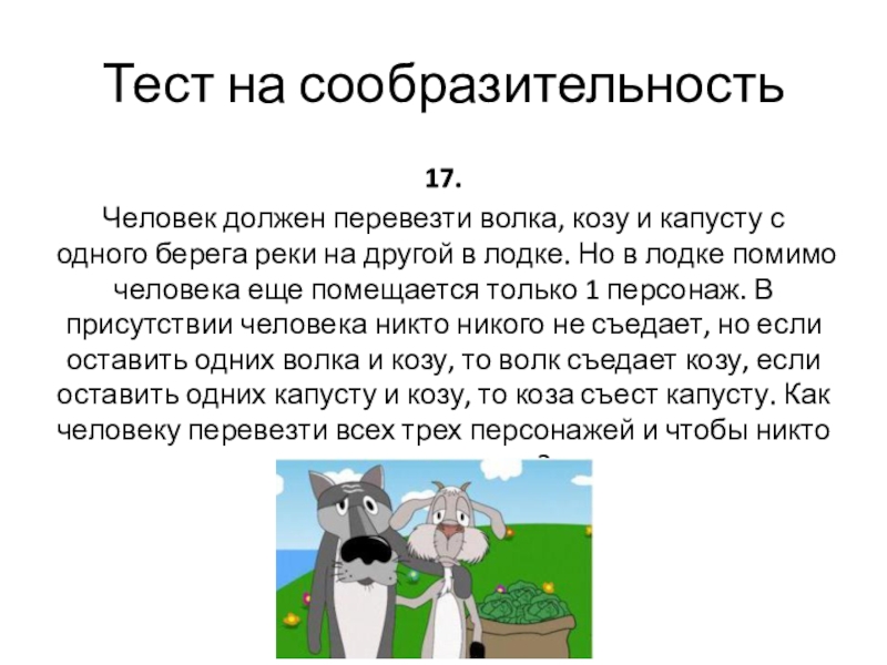17. Человек должен перевезти волка, козу и капусту с одного берега реки на другой в лодке. Но в лодке помимо человека еще помещается только 1 персонаж. В присутствии человека никто никого не съедает, но если оставить одних волка и козу, то волк съедает козу, если оставить одних капусту и козу, то коза съест капусту. Как человеку перевезти всех трех персонажей и чтобы никто никого не съел?