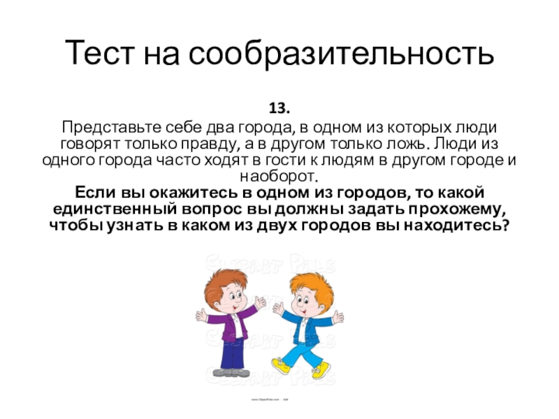 Ответ: Нужно спросить: Вы местный? В правдивом городе вам всегда скажут да, даже лгуны из другого города. В лживом городе все скажут НЕТ: и местные лгуны и не местные правдивые люди.