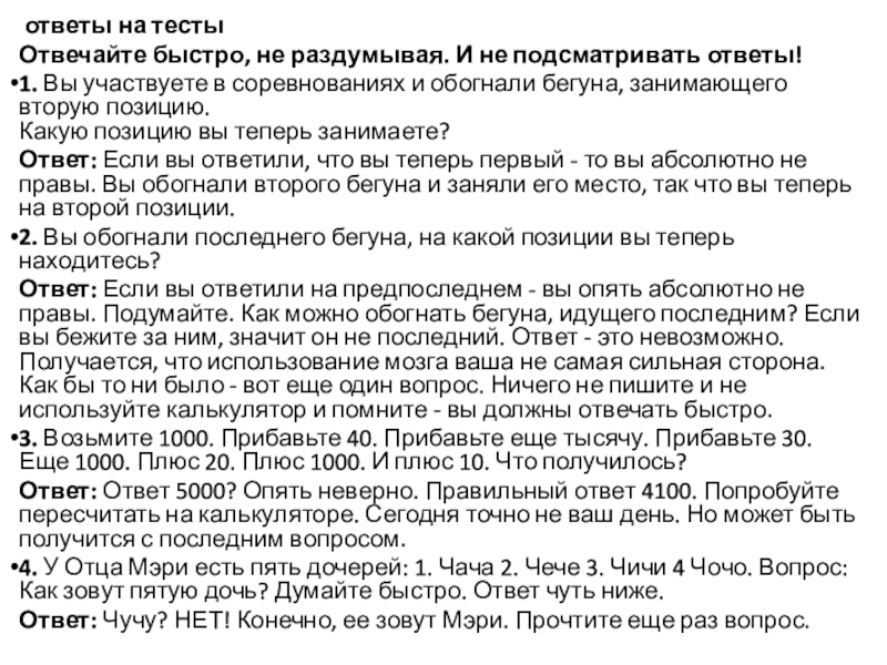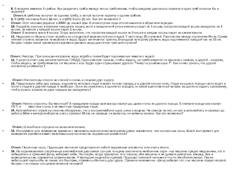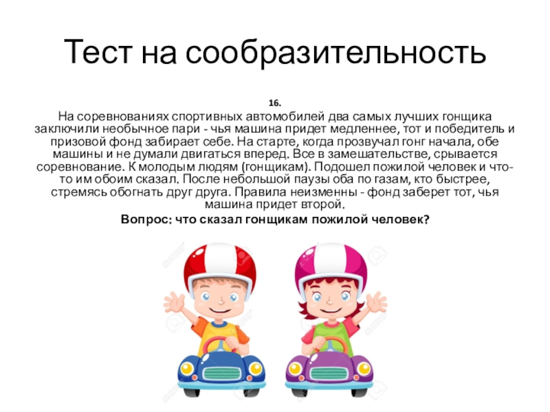 16. На соревнованиях спортивных автомобилей два самых лучших гонщика заключили необычное пари - чья машина придет медленнее, тот и победитель и призовой фонд забирает себе. На старте, когда прозвучал гонг начала, обе машины и не думали двигаться вперед. Все в замешательстве, срывается соревнование. К молодым людям (гонщикам). Подошел пожилой человек и что-то им обоим сказал. После небольшой паузы оба по газам, кто быстрее, стремясь обогнать друг друга. Правила неизменны - фонд заберет тот, чья машина придет второй. Вопрос: что сказал гонщикам пожилой человек?