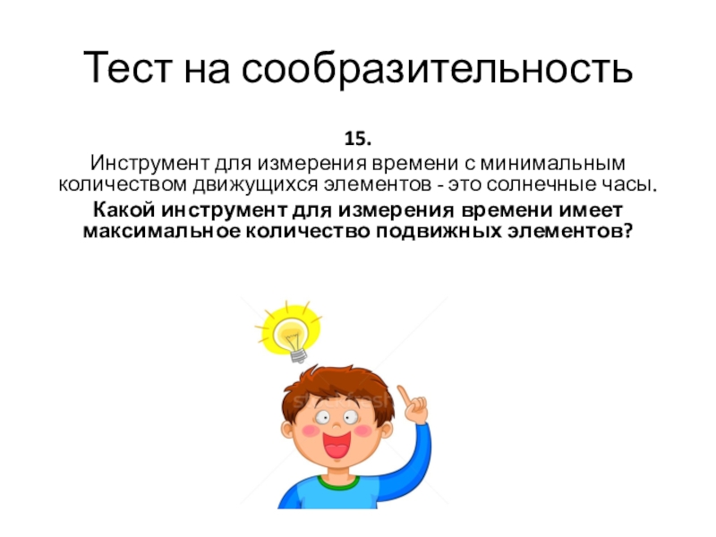 15. Инструмент для измерения времени с минимальным количеством движущихся элементов - это солнечные часы. Какой инструмент для измерения времени имеет максимальное количество подвижных элементов?