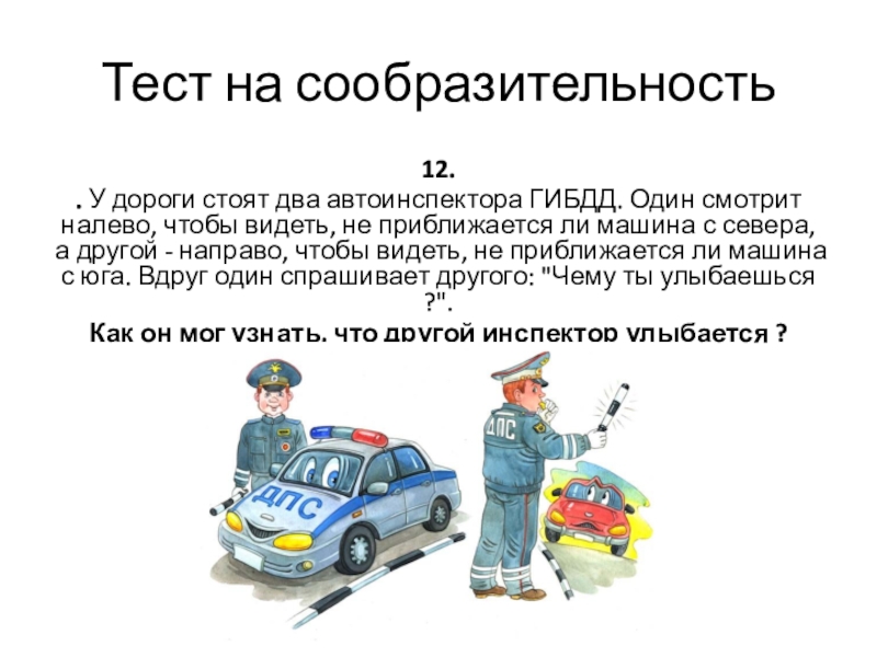 смотрит налево, чтобы видеть, не приближается ли машина с севера, а другой - направо, чтобы видеть, не приближается ли машина с юга. Вдруг один спрашивает другого: "Чему ты улыбаешься ?".