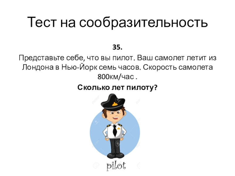 Представьте себе, что вы пилот. Ваш самолет летит из Лондона в Нью-Йорк семь часов. Скорость самолета 800км/час . Сколько лет пилоту?