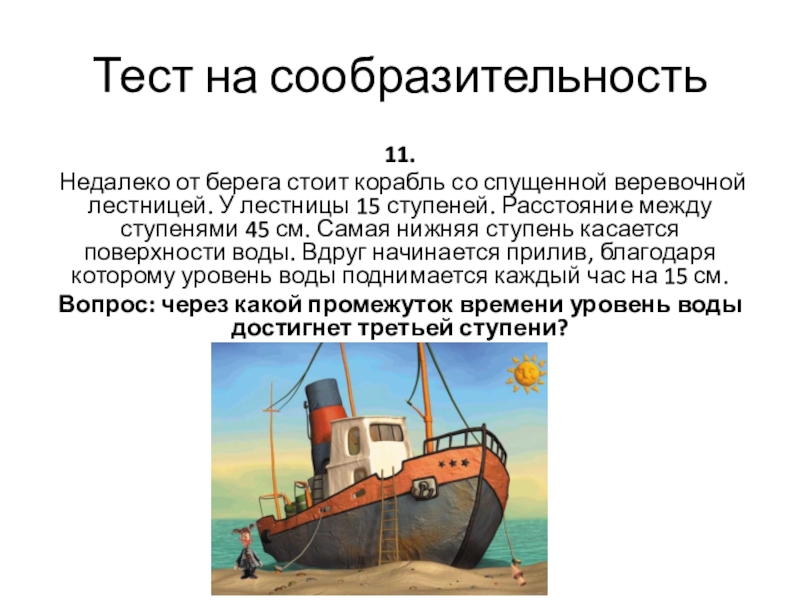 веревочной лестницей. У лестницы 15 ступеней. Расстояние между ступенями 45 см. Самая нижняя ступень касается поверхности воды. Вдруг начинается прилив, благодаря которому уровень воды поднимается каждый час на 15 см.