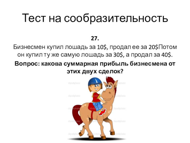 Бизнесмен купил лошадь за 10$, продал ее за 20$Потом он купил ту же самую лошадь за 30$, а продал за 40$.Вопрос: какова суммарная прибыль бизнесмена от этих двух сделок?