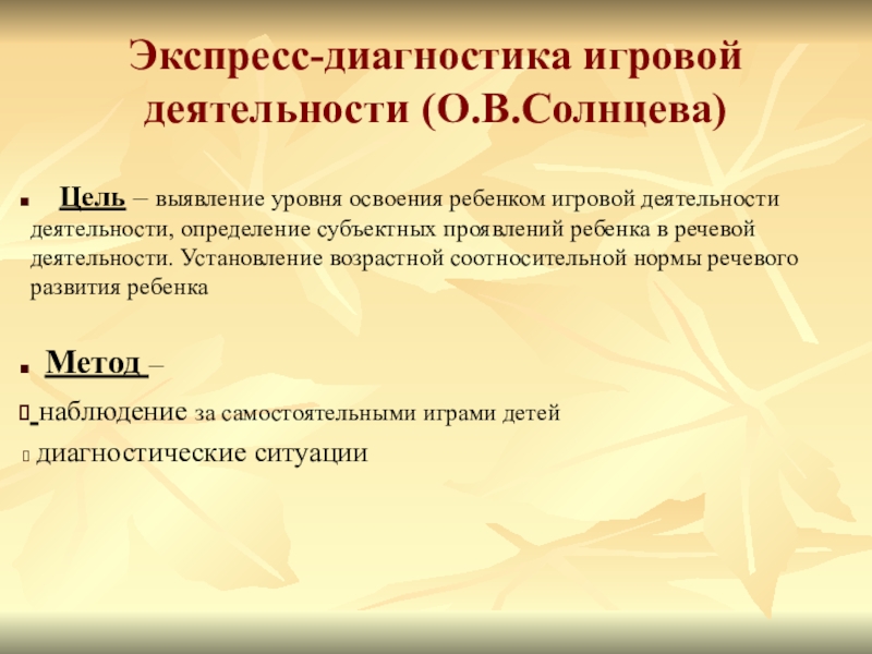 Слайд 19Экспресс-диагностика игровой деятельности (О.В.Солнцева)