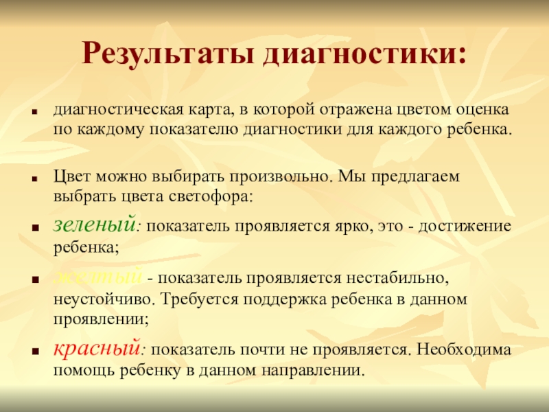 желтый - показатель проявляется нестабильно, неустойчиво. Требуется поддержка ребенка в данном проявлении;