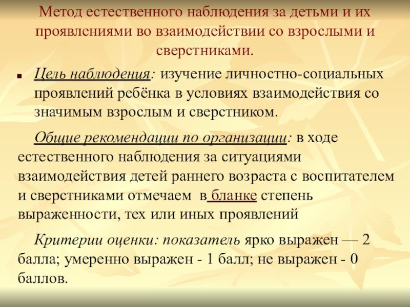 Слайд 16Метод естественного наблюдения за детьми и их проявлениями во взаимодействии со