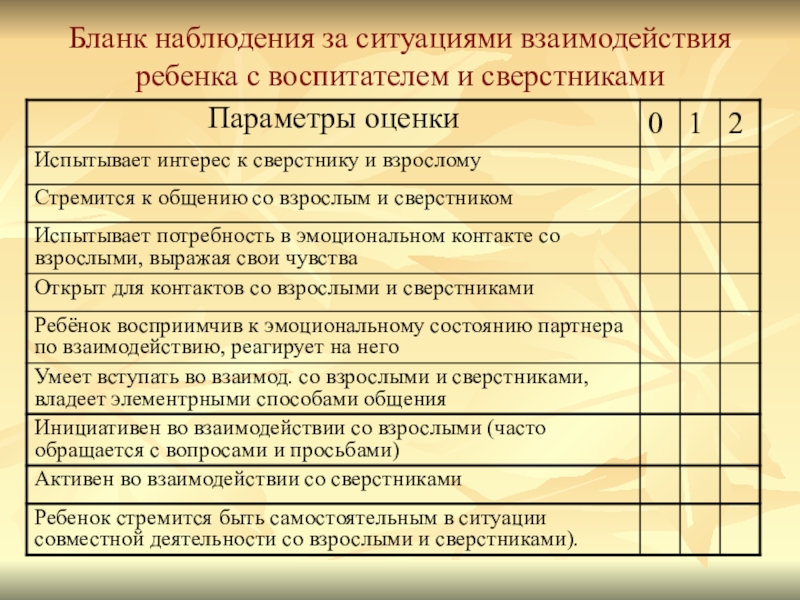 Слайд 17Бланк наблюдения за ситуациями взаимодействия ребенка с воспитателем и сверстниками