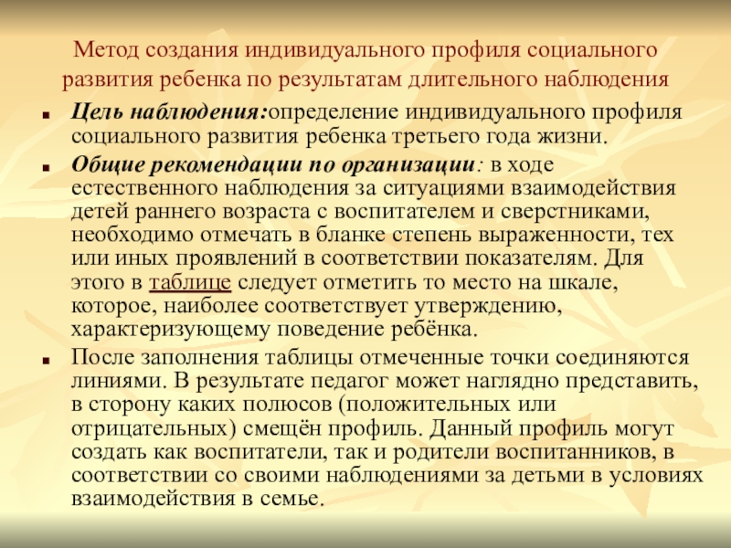 Слайд 18Метод создания индивидуального профиля социального развития ребенка по результатам длительного наблюдения