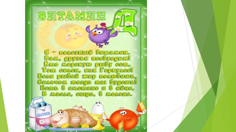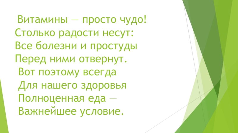 Слайд 17 Витамины — просто чудо! Столько радости несут: Все болезни и простуды Перед ними отвернут.  Вот