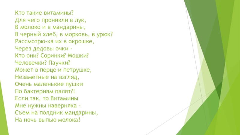 Кто такие витамины? Для чего проникли в лук, В молоко и в мандарины, В черный хлеб, в морковь, в урюк? Рассмотрю-ка их в окрошке, Через дедовы очки - Кто они? Соринки? Мошки? Человечки? Паучки? Может в