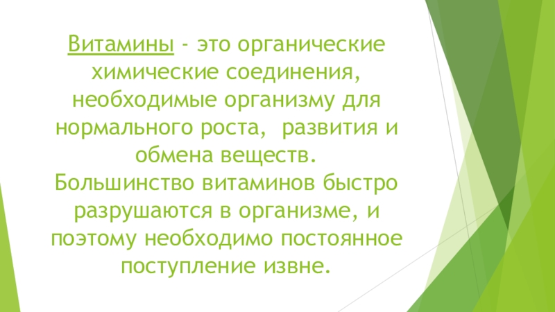 развития и обмена веществ. Большинство витаминов быстро разрушаются в организме, и поэтому необходимо постоянное поступление извне.