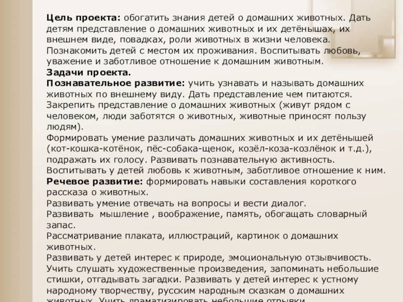 Слайд 3Цель проекта: обогатить знания детей о домашних животных. Дать детям представление