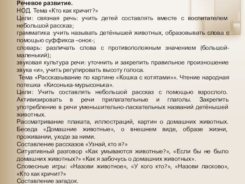 Развивать у детей интерес к природе, эмоциональную отзывчивость. Учить слушать художественные произведения, запоминать небольшие стишки, отгадывать загадки. Развивать у детей интерес к устному народному творчеству, русским народным сказкам о домашних животных. Учить драматизировать небольшие отрывки.